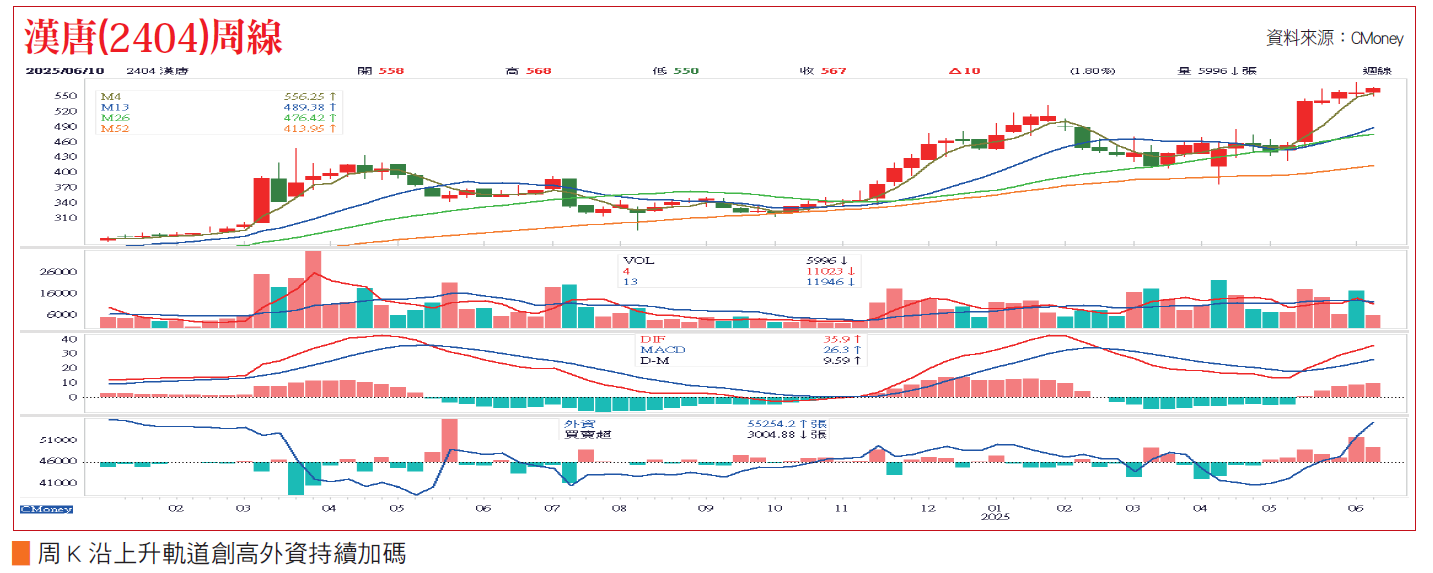 廠務指標廠商漢唐(2404)去年每股大賺32.4元,今年台積電及美光積極擴產下,目前在手訂單已突破700億元,預估今年營收有望呈現兩位數成長,股價持續創高。