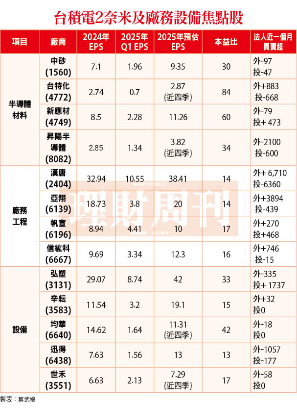 其他像是新應材(4749)的光阻周邊材料—表面改質劑,今年甫切入2奈米製程、再生晶圓的昇陽半導體(8082)因應2奈米需求,今年提前擴產至月產能80萬片,都值得留意。