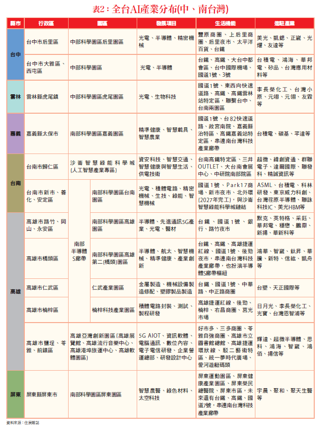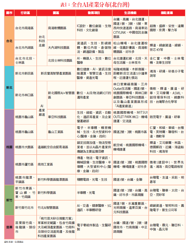 《住展雜誌》也以「台灣如何成為國際AI巨頭的終極選項」做專題討論,根據其調查,此次AI所引發的熱潮,將從北、南兩大AI研發據點開始發酵,分別是由北士科、大內科到南軟園區的「台北科技廊帶」,以及包含南科、橋頭到亞灣區的「南部半導體S廊帶」,再沿著西部高鐵路線,進一步串聯大大小小的半導體相關產業聚落,成為南來北往輸送設計首腦養分的一條臍帶(表一、表二)。