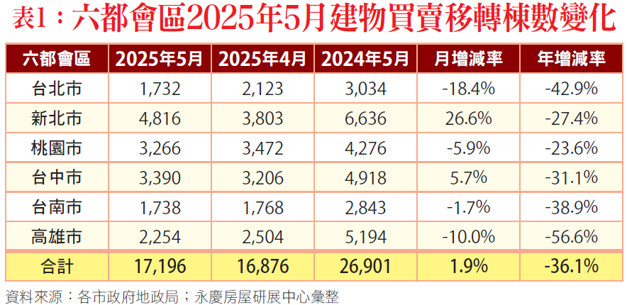 六都會區公布今(2025)年五月「建物買賣移轉棟數」,六都交易量合計為17,196棟。其中,新北市月增26.6%,台中市月增5.7%,其餘四都均較四月減少,台北市月減18.4%,桃園市月減5.9%,台南市月減1.7%,高雄市月減10.0%(表一)。
