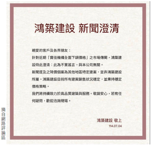 上述消息,迅速在網上「炸開」了,民眾樂見建商「讓利」,討論熱烈。但是,鴻築建設卻發新聞澄清,針對近期「寶佳機構全面下調價格」之市場傳聞為不實謠言(如附圖)。