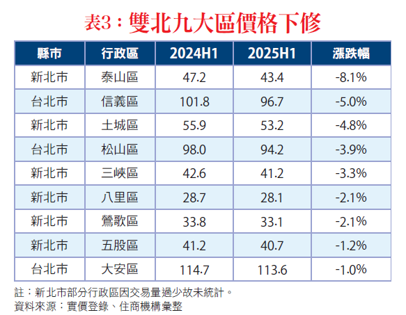 根據實價登錄統計,雙北部分行政區2025年上半年中古平均房價出現鬆動,其中以新北市泰山區跌幅最大,成交單價約43.4萬元,較去年同期下跌8.1%(表三)。