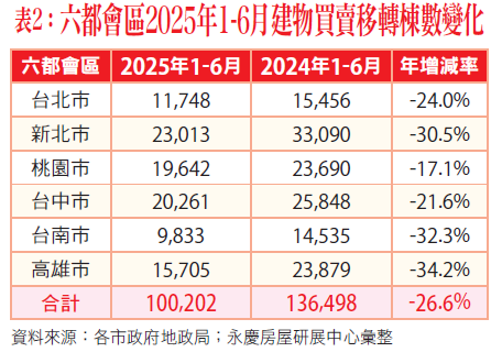 陳金萍表示,進一步觀察今年上半年(1-6月)六大都會區建物買賣移轉棟數,六都整體交易量合計為100,202棟,較去年同期年減26.6%(表二),顯示今年房市交易相對低迷。