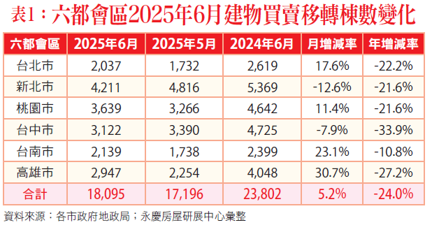 永慶房屋研展中心副理陳金萍說明,6月六都建物買賣移轉棟數月增5.2%,六大都會區增減互見,新北市與台中市量縮,分別月減12.6%與7.9%,其餘四大都會區均較5月量增,其中,台北市月增17.6%,桃園市月增11.4%,台南市月增23.1%,高雄市月增30.7%。