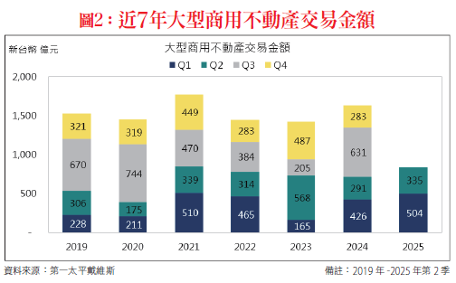 第一太平戴維斯研究部資深協理丁玟甄指出,儘管受到美國關稅政策與政府打房措施的雙重影響,不動產市場氛圍保守觀望,但在科技業大型買賣的支撐下,第二季大型商用不動產(單筆3億元以上)成交金額為335億元,年增率為15.4%,合計2025年上半年成交金額為840億元,年增率17%(圖二)。