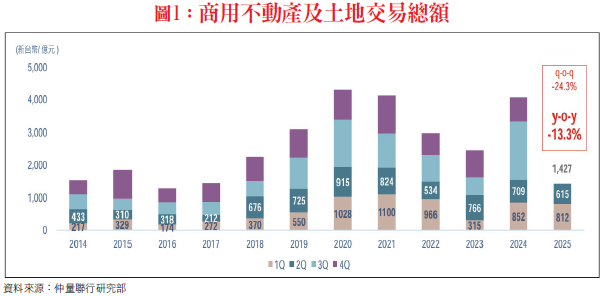 根據仲量聯行統計,2025年第二季台灣不動產交易總額為新台幣615億元,季減24%、年減13%。2025年上半年累計交易金額達新台幣1,427億元,較去年同期下滑9%,市場觀望氣氛濃厚(圖一)。