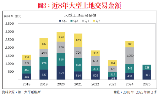 相較於商用地產有支撐,再看土地交易動能,卻是「價穩量縮」格局。根據戴德梁行統計,2025年上半年土地交易總額約870億元,為近兩年單季交易量之低點。交易量下滑,主因是央行限貸措施仍未鬆綁,導致高總價土地因自有資金門檻過高而乏人問津。