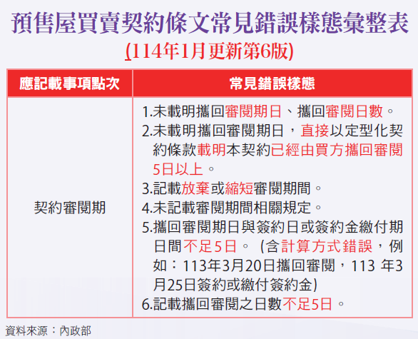 二、預售屋買賣契約條文常見錯誤樣態彙整表(114年1月更新第6版)