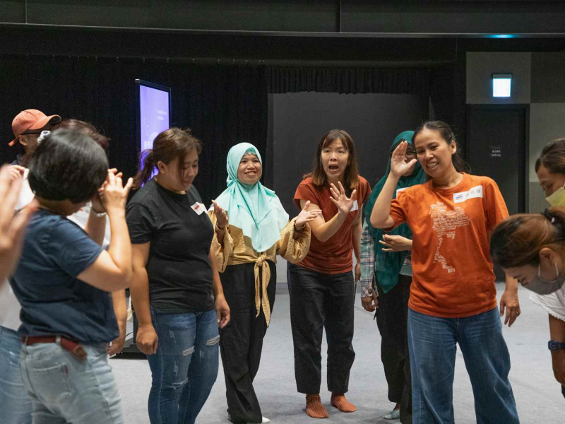 民眾劇場工作者曾靖雯帶領的工作坊中,參與的新住民與移工朋友透過肢體感知展開對話,在模擬參觀展覽的情境中,彼此分組分享對藝術的想像、對藝文空間的渴望與曾經遭遇的距離。例如:藝文活動訊息未被發布至移工常用的社群平台、語言隔閡造成理解障礙等……,這些困難從未被大聲說出,卻真實地影響了參與的可能性。