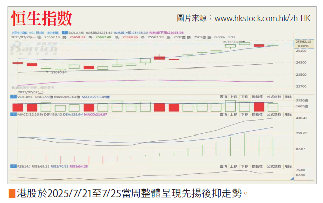 2025年7月21日至7月25日這一周,香港股市整體呈現先揚後抑的走勢,三大指數在周初延續上漲勢頭,但周五出現明顯回調。具體來看,恒生指數在7月21日開盤24991.14點,至7月25日收盤報25388.35點,全周累計上漲2.27%。恒生科技指數在7月21日開盤後最高報5604.06點,7月25日收於5677.90點,全周累計上漲2.51%。恒生國企指數在7月25日收報9150.49點,全周累計上漲1.83%。