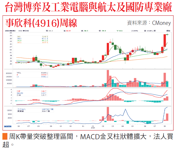 美國8/1公布台灣對等關稅為20%後,股價還能創今年高的公司,相對有底氣。統計上市櫃公司8/1迄截稿8/6日,股價創今年高的有88檔,其中8月以來三大法人買超逾300張的有事欣科、世禾、倫飛、奇鋐、智邦、金像電、台光電、新普、雷虎、三商電、台達電、台玻、中光電、長榮航太、華南金、第一金、中興電、神達等36檔,這些強勢股可以多加留意。
