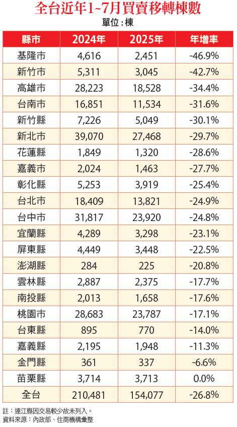 根據內政部統計,全台一至七月買賣移轉棟數達15萬4,077棟,對比去年同期的21萬481棟,年跌26.8%,並創下自2018年以來新低。賴志昶分析,全台上半年受央行第七波信用管制措施餘波衝擊,加上限貸令使買盤進場意願急凍,令整體買氣急凍。