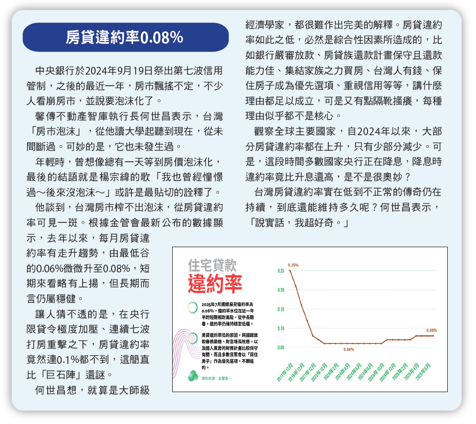 何世昌想,就算是大師級經濟學家,都很難作出完美的解釋。房貸違約率如此之低,必然是綜合性因素所造成的,比如銀行嚴審放款、房貸族還款計畫保守且還款能力佳、集結家族之力買房、台灣人有錢、保住房子成為優先選項、重視信用等等,講什麼理由都足以成立,可是又有點隔靴搔癢,每種理由似乎都不是核心。