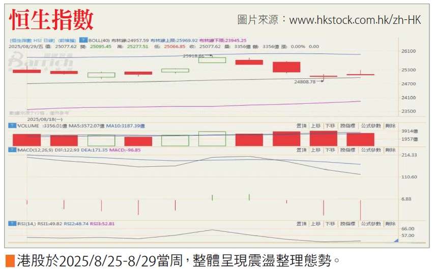 2025年8月25日至8月29日這一周,香港股市呈現震盪整理態勢,三大指數在月尾收官階段表現分化。