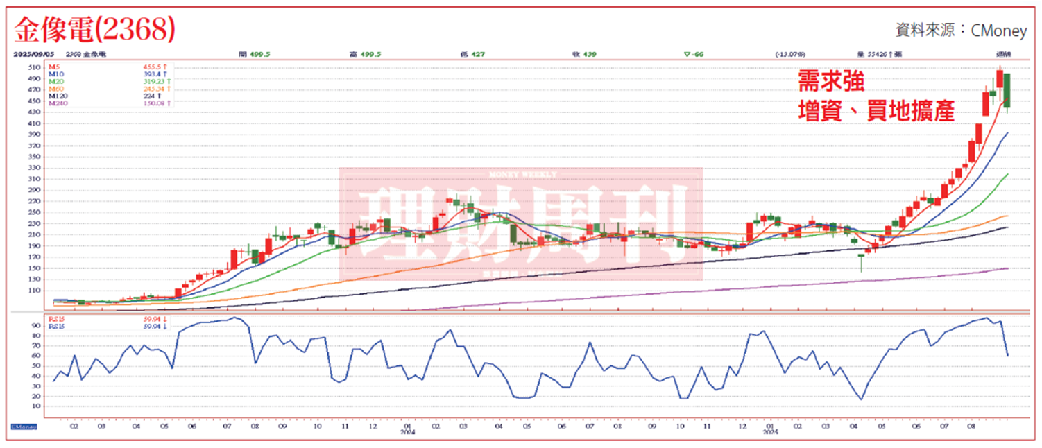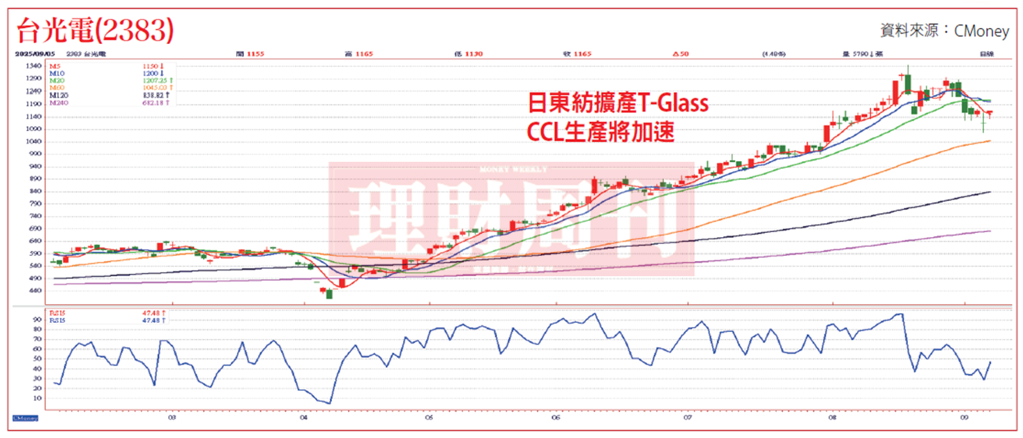 金居在232元附近遇到壓力,但9月4日收盤還守在十日均線之上,融券仍高達10223張,而且融券還沒嘗到甜頭,算是真正軋空股。事實上,日東紡擴產T-Glass,與CCL族群的台光電、聯茂、台燿、富喬、台玻、南亞等有直接的衝擊,這些股票下跌是合理的反應。
