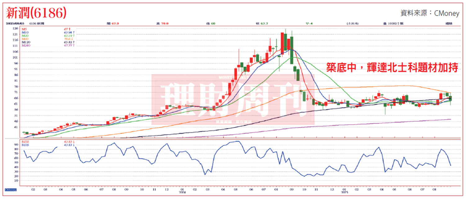 新潤在60元上下震盪打底十一個月,這個底部有機會完成所有均線糾結後站穩。