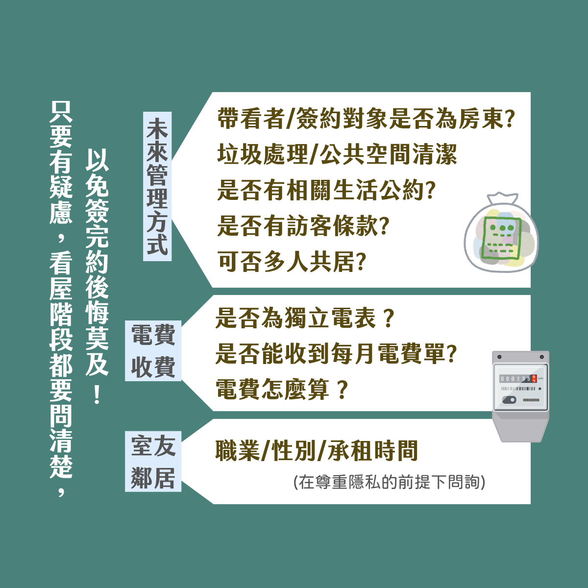 加上租屋是基於長期居住的考量,也應確認房東、管理者,或室友,甚至社區的情況,其實是必要的。