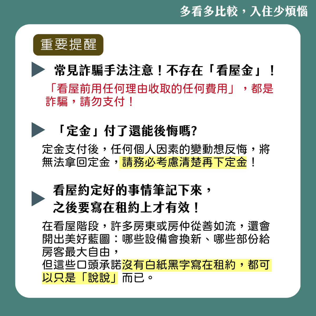 另重要提醒,也就是「看屋金」並不存在,「看屋前用任何理由收取的任何費用」,都是詐騙,請勿支付!