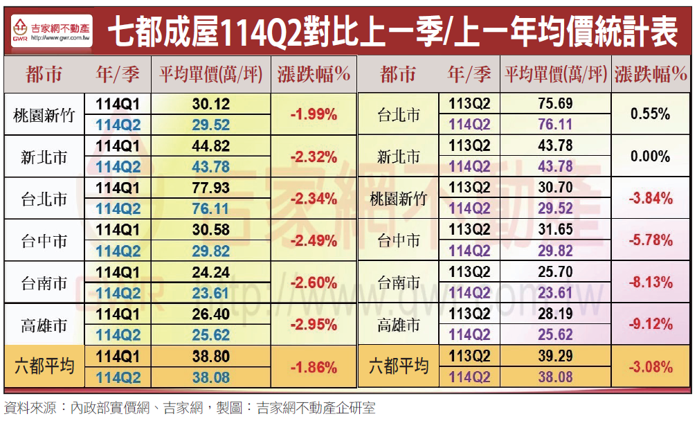 吉家網公布今年第二季六都房市季報,六都房價平均季跌-1.86%、年跌-3.08%,同時,均價已經連跌三季,證實自2024年第四季開始房市進入空頭。六都行政區跌勢「強弱分明」,超過七成下跌,但仍有二十一個行政區表現抗跌。