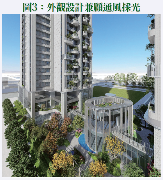 2.垂直綠化:除了地面綠化外,於低樓層的商業空間及公設區域,退留複層露臺與景觀綠台,並在住宅單元中設置景觀綠化設施,為都市空間注入更多層次的綠意與生機。