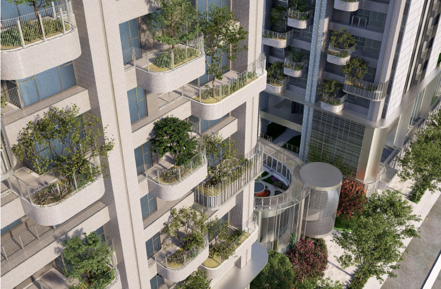 a.將綠蔭樹海綿延至空中花園,藉由立體跳島的綠化手法,延續「草悟道」、「勤美誠品_植生牆垂直綠化」、「勤美之森」之綠化,再延伸至「勤美之真」,逐步編織出綠化友善的新都市文化,在地多樣生態的綠建築,美化台中都市天際線,調節淨化都市空氣。