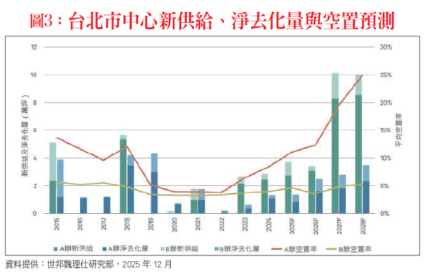 據世邦魏理仕研究部統計,未來三年間台北市中心新增的可租賃辦公室面積將高達23.5萬坪,與2025年市場總量體相比,相當於再增加20%的樓地板面積,可預期商辦供過於求的局面將逐漸浮現。