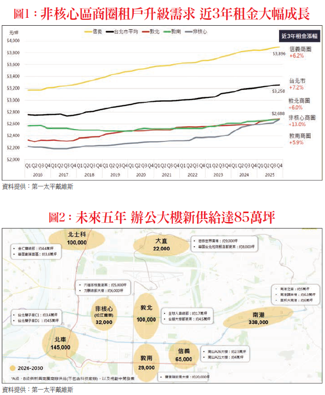 第一太平戴維斯公共關係暨市場研究資深協理丁玟甄指出,2025年有3棟新大樓完工,包括元大銀星、冠德民權、新光華山金融大樓,新供給約2.5萬坪,使得台北市A級商辦大樓空置率小幅上升至6.9%。另在新大樓帶動下,敦北與非核心(北車與松江南京)租金年增率超過3%,而非核心商圈租戶升級需求,近三年租金大幅成長(圖一)。