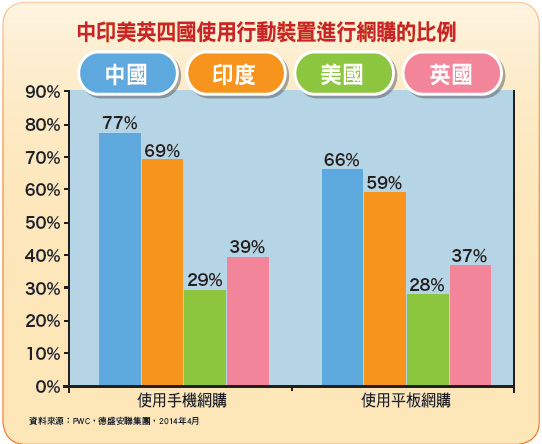 隨著中國崛起,歷經二○○八年金融海嘯、二○一一年歐債危機,不論世道如何變化,現在投資趨勢要想的是「未來的贏家是誰?」潘宇明認為,亞洲新消費如物聯網崛起,將主宰未來的投資。至於亞洲年輕世代的消費者,例如東南亞的馬來西亞、印尼及菲律賓年齡層普遍還是年輕化,考察亞洲各國收入,可發現中國年輕人有著收入高及消費力強的屬性,不像美國會隨年資增長,專業技能提升,收入才會逐漸提高,中國年輕人具備新世代發展的條件,受益最多,相對掌握更多的財富,因此,他們買什麼及如何買就攸關投資趨勢。而究竟這些亞洲新消費者都買些什麼?潘宇明建議不妨從休閒消費支出來看端倪(圖二),畢竟人均GDP跟人均消費成正比,人均GDP到一定程度例如一萬美元後,人均消費將會加速成長。總之,新消費者購買模式將主導未來十年的亞洲股票市場。三大趨勢看投資市場亞洲新消費模式跟過去截然不同,潘宇明建議可從三大趨勢來看:趨勢一,行動商務:亞洲新消費者因為有了行動物聯網,消費習慣發生很大變化,例如使用行動裝置進行網購比例,以中國跟印度較喜歡利用手機跟平板電腦進行購物,跟已開發國家例如英國及美國只有三○%左右比例差很多(圖三)。事實上,現在已經是隨時隨地可以行動裝置購物消費,例如二○一三年十一月十一日中國年光棍節,阿里巴巴平台光是一天就進帳五十七億美元;跟數周後美國的網購星期一只吸金二十億美元相比,可以預料中國即將成為全球最大行動商務市場。因此,不妨留意投資部位例如網路平台營運商、行動通訊軟體、線上購物平台。趨勢二,潔淨能源:過去中國經濟發展是以犧牲環境換來的,現在修復環境成為中國改革重點,因此,看準潔淨能源需求勢必會以每年八%以上穩定成長。