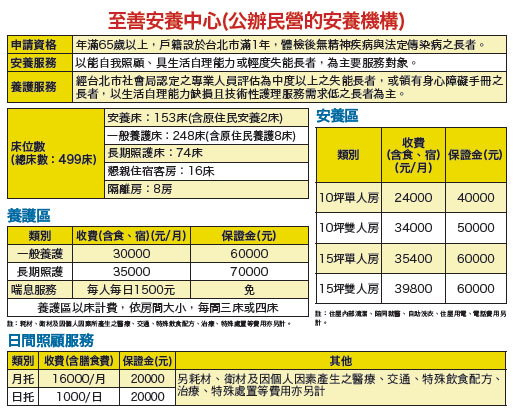 目前坊間老人住宅及安養機構主要服務的長輩都是健康老人,但也延伸有提供養護及失智照顧服務,目前除了內政部衛生福利部各在北中南區設有老人之家,提供給低收入戶的族群外,也有公辦民營的至善安養中心,只要年滿六十五歲,具生活自理能力或輕度失能長者,入住保證金從四到六萬元不等,每月生活費約二萬九千元到四萬元左右。