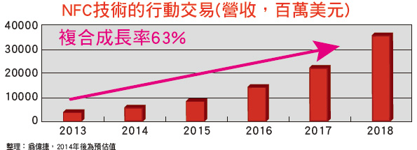 行動支付的方式與市場行動支付不是只有NFC技術,還有列印或掃描二維條碼、點對點感應、信用卡晶片感應等,其中現在市場仍然以二維條碼的相關支付方式為主,NFC的行動支付方式占第二,以行動支付的成長預估來看,將以年複合率二○%的速度成長,而其中就NFC的行動支付的預估將會以年複合成長率六三%的速度增加,因此可知道NFC的行動支付的成長動能將優於其他(圖一)。目前在全球NFC行動支付技術發展中,共有三家龍頭廠商分食,分別是:恩智浦、Inside secure跟意法半導體,雖然都是NFC技術的廠商,但是其主要應用領域是不同的範圍,恩智浦的市場主要在手機的行動支付;擁有大量NFC矽智財的Inside Secure主要則是在晶片金融卡,另外,在意法半導體則是以標籤型產品(RFID、NFC)為擅長,並且以MCU的方式針對安全元件做開發。目前NFC的手機行動支付分別有三種模式:一、MicroSD卡。二、SIM卡。三、直接嵌入在手機電路板的嵌入式晶片組。其中全球市占最高的就是恩智浦,而恩智浦占全球手機NFC晶片出貨量約有九成,在手機嵌入式的NFC晶片出貨量也有市占七成水準,因此在手機行動支付這塊領域中恩智浦可說是佈局最完整的國際級領導廠商,其應用以嵌入式以及SIM卡為主。