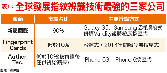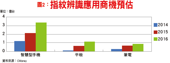 而現階段蘋果所採用的NFC行動支付晶片的建置方式為內嵌式,內嵌式的好處就在於跟著手機,可以一次將所有的信用卡整合在晶片的安全元件之中,若是SIM卡則是要看電信營運商跟哪些金流業者合作,而micro SD卡則是每家銀行各一張的話,如何能夠整合在一支手機中都還未有解決方案,因此就內嵌式晶片而言就相對便利。POS機台普及的重點 在與金流業者合作除了晶片端之外,最重要的就是在終端的讀取設備,也就是POS機的設置,Berg Insight預估在POS終端需求的安裝量將從二○一二年的六七○萬台增加到二○一七年的四四六○萬台,年複合成長率為四六%。振樺電(8114)、飛捷(6206)、同亨(5490)、樺漢(6414)以及精誠(6214)等五家,其中出貨POS機較為明顯的有同亨、精誠、振樺電以及飛捷等四家。由於POS機主要為金流端的接收應用產品,因此在產品生產後也需要送產品認證,也由於認證期間長,因此一旦能夠通過,外來新進競爭者切入供應鏈難度較高,而在接下來針對於POS機台如何支援NFC行動支付方式,就成為各家廠商的競爭關鍵。預估NFC行動支付初期將會以NFC刷讀卡機為主要出貨機型,而主要市場仍然集中在北美洲,之後才會以四合一型的POS機為主要機種。初期以北美市場為主推區域,則同亨的最大客戶為全球最大信用卡清算公司,占同亨營收比重約六○%,現在已與Apple Pay合作,將帶動下半年同亨的對於NFC刷卡機的拉貨力道,為這波Apple Pay行動支付商機中第一輪的主要受惠者。後續才看在北美的推廣結果以及國內其他業者能否跟進取得金流業者相關認證,其中國內在銀行端有七○%市占率的精誠可望領先國內其他業者。NFC行動支付成功的關鍵─指紋辨識指紋辨識系統雖然不是嶄新的科技名詞,但是搭配行動支付倒是頭一遭,因此又再次吸引全球消費者以及智慧型手持裝置的開發者目光,就在全球眼光都在關注蘋果的同時,其實早在蘋果新品推出之前,指紋辨識科技也在對岸的中國大陸悄悄地普及中,原因就在於中國大陸推動二代證上路,而新一代身分證是需要內建指紋資料,如此一來也就帶動指紋辨識系統在中國大陸的新一波商機。一般來說指紋辨識系統的產業鏈從上游到下游可以大致分成:指紋辨識晶片設計、晶圓代工、晶片測試、模組及系統級封裝再到晶片代理商,最後才到組裝代工廠與手機組裝,看起來其產業鏈就如同一般半導體產業的上下游關係,因此在指紋辨識技術發展的過程中,以IC設計產業為主要研發中心,目前全球發展指紋辨識技術最強有三家:新思國際、Fingerprint Cards以及Authen Tec.(表一)。其中新思國際在指紋辨識晶片領域為最主要領導廠商,原因在於新思在二○一三年併購Validity後,取得大量指紋辨識專利,因此在市場占有率也達到九成之譜,現在蘋果所採用的指紋辨識技術為二○一二年所購併的Authen Tec.獨家提供的按壓式電容射頻感測指紋辨識晶片模組,在這些大廠研發指紋辨識的產品中,以光學式、電容式以及射頻感測式能夠被大量生產以及商轉,尤其是新思國際的指紋辨識產品專利大都集中在電容式為主。指紋辨識已經不是新聞,在海關都可以見到其應用,這些主要都是以光學式為主,因為光學式可以透過光學原理讓指紋的變倍率較佳(1:10),所以感測時間較短,也相對方便,但是其系統體積就相對較大,也限制光學式的應用領域只能停留在門禁、門鎖等。而滑動光學型也同樣受到體積限制,只能應用在平板或是筆電上,然而就電容式來看,其體積就相對較能符合現在手持式裝置輕薄的特色,但是缺點是因為變倍率(1:1)較劣,所以可能在辨識時需要多次按壓,同時價格也相對較高。因此未來的趨勢可能會集中在結合電容與射頻或是電容結合與光學式的複合式產品為主,如:iPhone 6所採用的便是電容與射頻結合的Touch ID。未來應用商機及受惠廠商由於蘋果透過推動NFC行動支付為指紋辨識科技帶來的曙光,未來指紋辨識的產業商機將進一步透過手持式裝置成長,根據研調機構預估,未來指紋辨識應用商機將以智慧型手機、平板電腦以及筆記型電腦為主,尤其是應用於智慧型手機,將在未來二到三年內以年複合成長率超過五成的速度發展,全球出貨量將從去年的三千萬顆,到二○一六年的五‧三億顆,就可能為台廠帶來超過新台幣三千億元的商機(圖二)。