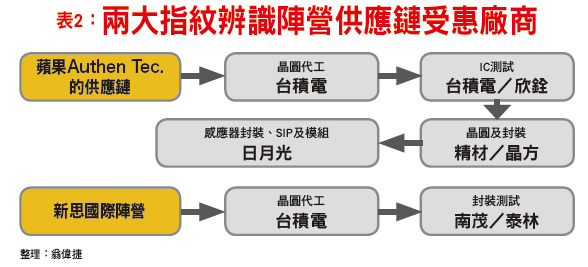 台灣廠商之中當然是原先為新思國際以及蘋果Authen Tec.的供應鏈為最主要的受惠廠商,當然其中包括台積電(2330)、頎邦(6147)、南茂(8150)、日月光(2311)以及泰林(5466)等,而這些都是市場早已經知道的間接受惠股,當然在國內還有不少公司正積極地磨拳擦掌想要切入指紋辨識領域成為直接吃到商機的受惠企業,其中以IC設計業為最主要領導廠商,另外還有MCU廠、代理商等,以產業鏈中的各不同身分想吃這塊餅(表二)。