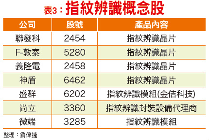 但是回歸到現實面來說,IC設計公司想要透過研發產品上市將遭受到國際大廠專利權的挑戰,尤其是在電容式晶片這個領域,幾乎都是新思國際的天下,難再有縫隙,反而投入研發光學式晶片的廠商,如義隆電(2458),是有機會闖出一片天,另外,就是以模組為主的廠商,如:盛群(6202),最為有機會在指紋辨識商機中分一杯羹。日前,義隆電宣佈與星友科技合作發展指紋辨識技術,獲得良好成果,而盛群也透過轉投資的金佶科技成功地研發出「類光譜」指紋辨識模組,並能夠達到3mm的薄度,是適合手持式裝置 (厚度約在7.5mm到9mm之間) 的規格,明年起將放量出貨。而蘋果的射頻感測指紋辨識則是早有專利權擋著,國內廠商較無法突破,因此未來國內在指紋辨識商機中較有機會具有推升營運動能的指標企業將落在義隆電和盛群上(表三)。