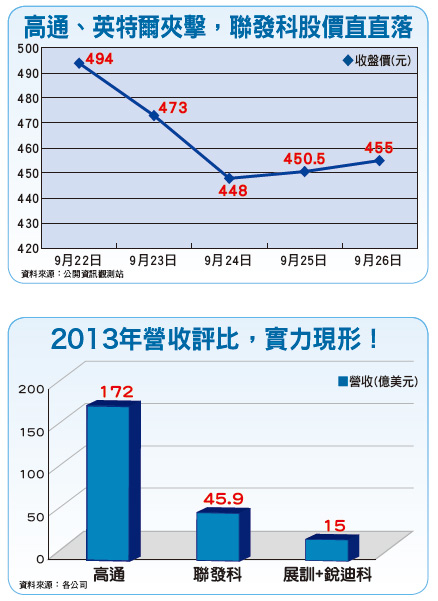 林建宏認為,初期英特爾應該還不會收取IP授權費,但英特爾應是力拚明年新興市場的手機出貨,這是英特爾的絕佳機會,讓市占達到一五%以上,否則便失去產業競爭力。另外,由於製程最後的製造生產階段,必須進入英特爾工廠內進行,英特爾還可以在這一端賺到錢。最後,英特爾素來緊密結合產、官、學界,扎根學府,從大學時代便開始培養能做英特爾製程、架構的人才。就像英特爾也和台灣大學合作,成立研究中心一樣。而紫光集團和大陸清華幫關係緊密,紫光背後的撐腰者,便有許多是清華幫的官二代。利多3.展訊搏架構 差異化機會至於對展訊,同樣是利多。就晶片架構來看,展訊不見得要把所有產線都移做X86系統,也就是說,展訊可同時發展安謀和英特爾架構。另外,由於晶片差異化,製程、效果都不同,還提供了終端消費者另一種新選擇,同時也開啟另一新客群。再者,計畫若順利推行,明年下半展訊有機會以十四奈米的系統晶片(SOC)攻打中、高階市場,是一大產業願景。陸府+美企技術 台廠小心!對展訊而言,英特爾入股紫光,獲得的不光是資金和技術支援,得到的還是一次向上提升的機會。林建宏坦言:「展訊如果繼續沿用安謀架構,加上開發成果又落後,到底何時才能上位?」大陸工信部對紫光下達目標,五年內銷售額達到一百億美元。截至去年,展訊和紫光另一子公司銳迪科的總收入,也才十五億美元,距離工信部的目標,還有很長的距離。對展訊來說,得到國際級的奧援,將是超越聯發科的關鍵布局。但業界多認為,短時間內仍不會對聯發科構成威脅。外資分析師表示,展訊需要六至九個月發展新產品,如果順利進行,最快也要等到明年中,才會生產出和聯發科抗衡的新產品。而在這期間內,聯發科便能有所布局和行動,展訊依然苦苦追趕。但是一位專門做IC設計的F股陸商高層卻直言,在中國大陸,比的不是實質面的結果,而是一種人強的氣勢。在鬥爭教育影響下,就算已經很富有,大陸人在乎的是一股氣勢。可是這種氣勢,不是逞口舌之快,而是做出氣勢後,還能順勢導利。大陸的最終目標,是要做到不依靠其他國家,也能自成體系發展半導體產業。形勢比人強,有一便有二。如果英特爾願意進來,那麼不也表示,高通、博通(Broadcom)這些大廠,接下來通通有機會大舉引進到大陸?那發展半導體產業最關鍵的人才、技術,也會快速引進。目前高通已和中芯合作二十八奈米晶片,博通也和上海市的官方機構和學校,共同推展WiFi Solution,但都沒有像英特爾這麼深入核心。尤其紫光背後有許多大陸官二代撐腰,展訊被紫光收購後,地位已不可同日而語。紫光在大陸被稱為「晶片國家隊」,集團顧問有習近平、溫家寶的子弟,多出身於清華幫。對抗宿敵高通策略 →快速快決+布局美、印若要談起展訊當前對聯發科最直接的威脅,恐怕還是人才忠誠度的問題。陸企挖角,這種事情防不勝防,除了儘量避免與展訊正面接觸,聯發科該如何避免?一位曾在聯發科研發部門擔任工程師,現任職某家專門製作中、低階晶片的上市公司研發高層透露,聯發科的研發模式是co-work(合作),團體打造產品。聯發科保不住人才,但透過專利申請,可以保護最重要的IC設計圖。F股陸商高層感嘆地說:「廠商寧願花錢申請專利,卻不願用高薪留住優秀人才,這是台灣科技業的悲哀。」但聯發科最急迫的挑戰,還是宿敵高通。高通少見地搶在聯發科發表首款4G六十四位元晶片前,在九月二十五日於北京舉行發布大會,發布產品包含高、中、低階晶片。以往高通走高端路線,聯發科通吃低階市場,兩強不相冒犯。現在高通已經直接「侵門踏戶」,踏入聯發科的地盤,加上技術還較為領先,因此聯發科急欲解決這個問題。面對宿敵強勢威脅,前任工程師透露,聯發科已經加快產品的開發時間,要以速度和高通一決高下。以往聯發科的產品開發週期約六~七個月,現在必須提前到三~五個月完成。在市場布局上,以往通吃大陸的聯發科,也有所行動了。去年以來,聯發科在印度、美國加州都有大規模的布局。在印度新成立研發中心,未來人員規模將達五百人,目前印度市場的市占率,也有一○%。今年正式啟用加州研發中心,五個研發部門皆專注於高端4G市場。從九月二十二日到二十六日,短短五天內,聯發科的股價從收盤四九四元跌到四五五元。期間經歷高通在北京舉行的發布大會,以及英特爾入股展訊母公司紫光兩大重要事件,聯發科的股價,何時能穩定回升?回歸基本面來看,或許三~五個月後,聯發科以速度力拚高通,再推出新產品,便可看到技術面率先反映利多,股價強勢上升。面對高通和展訊雙面夾擊,蔡明介採速戰速決策略,縮短研發時間,三~五個月完成開發產品。大手筆入股紫光15億美元,英特爾在玩什麼把戲?英特爾入股中國大陸半導體廠紫光集團20%股權,注資金額15億美元,明年初完成這項交易。入股之後,英特爾授權紫光使用X86架構處理器於製造智慧型手機,擴展X86架構在行動裝置市場的規模,規劃明年上半年推出。而這筆投資還涉及一系列開發基於英特爾架構的晶片協議,這些晶片將具有調製解調器和無線連接等功能,開發目標為系統晶片(SOC)。這種晶片能用在新興市場,技術較先進的低價手機。首批基於英特爾架構的系統晶片產品,規劃明年下半年上市,由展訊和英特爾共同銷售。東方巨龍毫不手軟,棒打美國科技巨擘逼迫就範! 官方背景濃