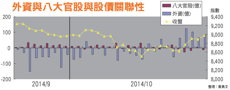 大盤跌深後驚驚漲,個股把握機會輪流反彈,外資空單回補大舉翻多,讓大戶措手不及被軋空手,而官股銀行則已獲利先下車…。食安問題重創台灣形象,加上前波外資連賣嚇跑融資,八大行庫默默吃貨;這回外資因滬港通延後快速回補空單作多台股,著實讓許多個股的主力大戶及停損的國內法人措手不及,此時官股銀行卻先獲利減碼,是為選後慶祝保留銀彈還是交棒法人穩定籌碼?究竟哪些個股穩中透堅,理周投研部歸納出官股銀行著墨的台灣50、寶滬深及八大類共三十檔個股供讀者參考。驚驚漲 獲利最佳時機對於台股而言,台股上漲會是驚驚漲還是一次到位,通常是考驗控盤者的心態,不過驚驚漲是時間與空間最好的處理模式,一次漲到高點就結束,通常只有股票才會發生,台股加權指數漲跌是需要技術面、籌碼面、消息面、財務面缺一不可,在盤勢不明的時刻,驚驚漲是投資人最好的獲利時機,等到消息公布大部分都是短線高點。金管會主委曾銘宗上任以來,持續不斷釋放利多推升股市,而國內經濟狀況來看,各項數據趨向樂觀,今年不但保三沒問題,甚至可能調高經濟成長率。難怪股市下跌一千多點後,曾主委仍老神在在,他指出,台股兩大不確定因素為外資動向與國內食安風暴,此時台股應該逐漸回歸基本面。而十一月三日提升台股成交量所射出的第四箭研判,應該會跟隨美股大漲而發酵。雖然美國量化寬鬆(QE)順利退場,但是歐洲等地區經濟復甦不是很順利,因此美國升息速度可能會延至明年下半年之後,屆時外資撤離亞洲的速度會減緩,加上食安風暴已經慢慢沉澱,加上十一月份要公布第三季季報,九月份新台幣升值,讓電子股有匯兌收益,股市基本上會朝向正面發展。股市是經濟櫥窗,會不會有選舉行情,還是要從大環境來考量。由於美國處於經濟成長時期,美元指數一路強漲,表示資金回流美國,最主要的原因在於美國失業率持續下降,消費者信心指數以及新屋開工指數等經濟數據皆呈現正向發展,而美國聯準會也準備了停止買進一五○億美元債券,量化寬鬆政策準備正式退場,但是聯準會官員也表示,QE成效備受肯定,如果未來再度面臨經濟困境,仍有機會再次推出。金銀四會 金融股風標至於台股十二月底的大事件,應該是兩岸的金銀四會,由於兩岸金融業遭服貿協議卡關,影響兩岸金融交流,所以我方聚焦於二大議題,一是向銀監會爭取,加速核准台資銀行在中國大陸設立據點,二是請銀監會爭取擴大人民幣回流管道。從目前僅限昆山,擴大到江蘇、深圳、上海等。而雙方正在密集研商議題中,由於兩岸服貿協議還躺在立法院,預料市場很難有重大的突破,雖然多家銀行在大陸申設分行、子銀行,台灣金管會已經核准,但是還在中國大陸主管機關審議中,將協調透過金銀四會,請對岸主管機關加速放行,對於好幾年處於低檔的金融個股,或許就是有政策面加持的效果,因為金融股是八大官股可控制的範圍,也是最近外資買進的標的物。金融期只是四大期指中率先站穩季線者,在大盤尚未轉強以前,金融期相對於其他電子期比較強勢,暗示前途是光明的。目前大盤已經止穩的情況下,金融個股已經漲多了,也暗示將回檔修正整理,未來盤整結束後,不妨可以注意此類股走勢。