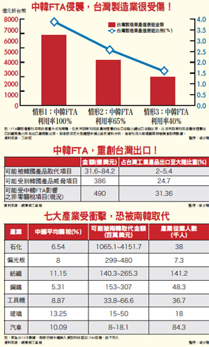這不是我自己說了算。巴克萊證券今年六月出具一份一百四十五頁的報告,以「Hello, China; Goodbye, Taiwan?」(中國,你好;再見了,台灣)為題,點出中國本土廠商崛起,中國從需求者變成供應者。專門做蘋果公司(Apple)生意的台商,已經漸漸被陸商取代。中韓FTA會是場風暴!浪來了,還不知道會衝多高。問:中韓FTA壓境,大家都在談外貿替代、關稅減免、產業出走這些傷害,整體經濟影響程度多大?答:損傷肯定遠超過大家目前所想像!因為沒有把服務業考慮進去,台灣前往中國投資,已經從製造業移轉到服務業。只是用模型估算,不知道怎麼去量化服務業而已。我們的大專畢業生,很多畢業後從事服務業。製造業在萎縮,這對國家經濟造成很大的損傷。台灣三大產業裡面,兩個已經很危險啦!面板業軟趴趴,石化也不是策略性產業,徒留二氧化碳在國內,只剩下半導體業在支撐經濟。還有,大家以為南韓只看到龐大的中國內需市場嗎?不是這麼簡單而已,這是規模經濟啊!中國是世界第二大進口市場,第一大是美國。但是中國內需成長非常快速,它是在長大的。南韓在中國市場「練兵」、賺錢,累積資金後,繼續往上研發技術,成立或擴大品牌,壯大自己,再把產品銷往全世界。南韓不只針對中國市場,它是策略性地布局全球。南韓到處簽FTA,就會造成一股滾雪球效應!「悶經濟」十六年,台灣還有藥可救?問:中韓FTA是一個觸媒,引爆台灣正視景氣低迷、出口不振、成長率下滑、薪資倒退十六年「悶經濟」的困境,怎麼樣才能紓解?答:我想,朝野儘快達成一致共識,卡關的政策快放行。然後推行自由經濟示範區,並加速簽訂FTA,還要改善投資環境,這些都是突破「悶經濟」的解方。其實,只要馬英九啟動服貿,就能拯救這次中韓FTA的危機。根據「兩岸人民關係條例」,服貿已經生效了。但卡在立法院審查,拖了一年半啊(歎氣)。就行政命令來說,審查不能超過三個月,如果超過三個月,應該被視為通過,目前這情況確實有點離譜。那貨貿,一樣很難通過,貨貿要進立法院審查兩次,等於被割了兩刀。中國策略布局 台灣籌碼漸失現在中國才不理台灣咧!像服貿拖那麼久,國際上沒有這種前例。這次中韓FTA簽立,中國就是在跟台灣宣示,「要合作就來,不來就算了。」中國為什麼跟南韓簽?中國是扮演領導國的角色,拉攏南韓,對抗另一個強權美國。所以,不要說這次中韓簽定FTA,是賞我們一個巴掌。經濟困境是自己造成的,沒有改善投資環境,也沒有經濟安全的概念。講白一點,沒有憂患意識嘛。來台旅客中,商務旅客沒有成長,表示投資環境出問題了。租稅、土地各種條件,沒辦法吸引投資者,還有,你知道嗎?台灣沒有繼續蓋水庫,未來將嚴重缺水,缺水同時也會缺電,沒水、沒電,怎麼會有投資者願意進來?另外在新北市,很多工業用地更改成住宅用地,蓋滿了房子兜售。那製造業能去哪裡蓋工廠?只能往山坡地去,製造業萎縮得越來越厲害。相較於台灣,南韓因為有危機意識,反而急起直追。原本我們最有機會接軌中國市場,台商布局早、語言也相通,南韓是看到台灣跟中國簽了兩岸ECFA,嚇到了,趕緊啟動和中國簽訂FTA。問:民間把救經濟的希望,寄託在朝野之間,匯聚出共識,究竟朝野如何拿出成績讓人民「有感」?答:目前確實陷入一種僵局,在野黨用「兩岸協議監督條例」擋服貿,拖在那裡。但我認為,在野黨並非不了解國內陷入經濟危機,他們也知道經濟發展的機會在哪裡。只是很可惜,一旦陷入政治泥淖中,朝野之間就僵住了。朴槿惠出訪,背後都有企業撐腰,政商團結拚經濟。但台灣不是,台灣可怕的地方,在於製造對立。太多複雜的歷史糾葛、朝野紛爭,乃至內部撕裂的情形下,全體缺少團結一致的奮鬥精神。各做各的盤算,怎麼創造最大共同利益?政院各部會本位主義太重意識型態影響之外,我不得不講,行政院各部會的本位主義太嚴重,現在國發會的力量很薄弱,要怎麼推動?無論是中韓FTA衍生的危機,還是服貿卡關產生的不利效應,也許一年內還看不到非常明顯的經濟衰敗出現,但是兩年後,真的統統爆發在二○一六年。或許在野黨可藉此控訴馬政府無能,取得政權,可是我直說,一旦產業外移、人民急速失業、國家競爭力衰退,無論藍、綠執政,大家的日子都不好過。問:跟南韓大財團相比,台灣中小企業相對靈活,或許受到這次事件影響,能再激發創新的能量?答:在六○年代,台灣出口導向政策主導,我認為那時候的企業,具有高度創新力。但是很遺憾,現在已經沒有這種情形,產業空洞化了。當時發展半導體產業,花了工研院三○%?四○%的預算,也就是說,用政府科技專案的規格,去培養新企業,台積電(2330)、聯電(2303)都是當時培養出來的中流砥柱。產業移出多,移入少現在很可憐,產業移出去的多、新進來的少。那為什麼進來的少,回到剛剛我講的,投資環境不好嘛!台灣這座蕞爾小島,只能靠經濟和科技生存。科技是民間和軍事單位各自運行,但需要動用國防的時候,民間和軍方互相搭配。但我必須聲明,很多時候,還沒了解細節前,台灣很容易陷入泛政治化的圈套,其實也不需要自己嚇自己。台灣很早就開放外資投資洗衣業,有一天我拿衣服送洗,問洗衣店的老闆:「大陸人可以來台灣開洗衣店了,你怕不怕?」結果洗衣店的老闆回答說:「嘸驚、嘸驚,這是小生意,大陸人看不起。這在社區做,外地人也不好處理。」洗衣店老闆說得沒錯,好不容易,
