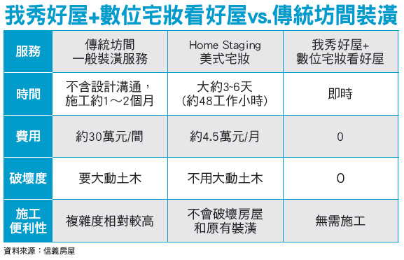 傳統產業也可以很科技、很時尚,房仲龍頭信義房屋為服務廣大的客戶,推出「數位宅妝」新服務,雖然眼睛看到的是空蕩蕩的房間,只要透過「數位宅妝」,過去只能憑空想像未來住家的模樣,現在進化到可以「預見」未來住家的理想全貌,信義房屋指出,透過這項創新的房仲科技服務,可以加快交易速度,創造買賣雙贏的局面。台灣房仲龍頭信義房屋繼首創七二○度互動看屋、手機看屋APP及美式宅妝等創新服務後,為提供超越顧客期待的服務,再次引領業界,率先引進工研院技術研發,經濟部與商發院共同輔導的「我秀好屋+數位宅妝看好屋」服務。數位宅妝四大特色「數位宅妝」是結合「3D擴增實境」 與「3D虛擬宅妝」兩項互動技術,透過「廣角度擴增實境」技術及「定位識別感應」讓客戶現場體驗虛擬的居家空間。未來消費者看屋,只要利用「數位宅妝」服務,立即體驗未來居家布置後的幸福藍圖,結合虛實整合的新式科技服務,充分打破空間和地域的限制。信義房屋策略長周莊雲強調,「數位宅妝」服務有四大特色:第一,「不用花錢」,不需花半毛錢,只需透過App軟體模擬展現居家裝潢設計,一秒鐘預見家的樣貌。第二,沒有多餘的實體裝飾,即能呈現房屋的真價值,並保持原有屋況,減少因屋況認知產生的爭議。第三,宅妝設計師可即時更新、上傳最新裝潢設計至雲端資料庫,虛擬居家更多元。第四,不用一根釘子,不需做水電、木作施工,環保又節能。周莊雲指出,以三十幾年來服務廣大客戶的經驗值來看,屋況或裝潢越好的房子,越能吸引買方的目光。根據內政部上半年住宅買賣移轉統計,屋齡三十年以上房子是北市交易最多的產品占三○.三%。從信義房屋今(二○一四)年近三季的成交統計也顯示,連續三季北市屋齡逾三十年以上的房子,成交比重占最多且皆突破三成,今年第二季更增至四成以上,平均每二.五戶交易買賣中就有一戶屋齡超過三十年。賞屋穿越虛實空間為了不讓屋況變成民眾買屋的疑慮,信義房屋將二○一○年推出的「Home Staging美式宅妝」概念服務延伸再進化,透過智慧行動裝置,推出全台首創的「我秀好屋+數位宅妝看好屋」服務,賣方不需大興土木,花大錢進行舊屋門面裝修;買方客戶則可實際看到虛擬家具擺放在家中的樣子,不管是沙發、書桌或餐桌椅等。