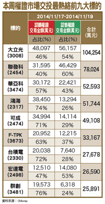台股在雙十一創下本波彈升高點九○六九點後開始震盪拉回,本周最低跌至八八二八點,跌幅超過二.五%,權證市場認購占比也持續維持在五至六成低檔,觀察本周權證交投熱門標的,前兩名雖仍為大立光(3008)及聯發科(2454),唯均以認售交投較為熱絡,顯示市場觀望及避險氣氛濃厚。