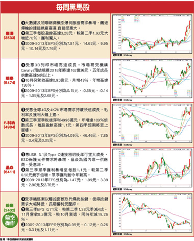 台股部分,選前台股相對國際股市而言疲弱許多,主要受到證所稅大戶條款明年強行實施,內資為主的中實戶及大戶買盤轉趨觀望,甚至轉買為賣,加上選舉影響,也使得市場觀望氣氛濃厚。但縣市長選舉順利完成,不確定因素消失,可望引導部分買盤回籠台股,但受大戶條款影響流失的資金,則需觀察星期四立法院開議結果而定。由於訊息顯示國內中實戶及大戶已經明白表示,要等大戶條款放寬或取消後才會進場,顯見大戶條款確實是造成台股資金動能減弱主因之一,在法案過關前恐怕將持續壓抑台股漲勢,預估等到大戶條款過關,大戶資金行情才會啟動,平均量能水準也才有機會回到千億元之上。不過選後國際股市有回檔疑慮下,外資十二月一日轉為賣超台股,尤其美股若回檔則法人恐持續賣出台股,則台股短期內恐也將跟進回檔,選後台股與國際股市連動性將增強,補漲行情恐會延後。鎖定績優股及法人關注、題材發酵標的操作策略及選股方面,選後政局動盪難免,加上國際股市回檔壓力加大,因此短期建議維持五成持股,同時調整持股鎖定績優股買強賣弱為原則。選股部分,持續留意獲利能力強法人關注股,包括Apple Pay行動支付、3D列印、電動車、汽車電子、機器自動化等等族群。Apple Pay概念股力旺(3529)、同亨(5490)、振樺電(8114)及飛捷(6206),3D列印大塚(3570)、實威(8416)及聰泰(5474),電動車F-貿聯(3665),汽車電子可留意為升(2231)、車王電(1533)及F-六暉(2115),機器自動化新漢(8234),以及單季盈餘年增率高個股,包括宏捷科(8086)、上緯(4733)、弘憶股(3312)及F-科納(4984)等等,目前持續看好沒有太大改變。中概股巨大(9921)、美利達(9914)、F-中租(5871)、永大(1507)及F-鼎固(2923),大數據(巨量資料)概念股嘉澤(3533)及超眾(6230)均持續看好。另外,留意部分題材發酵股,包括伺服器商機受惠股金像電(2368)、獲利暴增股旺矽(6223)、Type-C受惠股晶焱(6411)及汽車電子受惠股同致(3552)等等。台股一路發操作策略主力回籠,火力集中櫃買市場!理周之星:祥碩(5269)、創惟(6104)、瑞傳(6105)、新漢(8234)、F-六暉(2115)觀察指標:★以OTC指數為主要觀察指標★看櫃買指數成交量是否增加★注意期貨盤中走勢何時領先大盤★類股指標:生技股 指標股:美時(1795)、智擎(4162)操作策略:★OTC指數過季線,五成持股加碼至八成★沒過季線維持五成,破126點出清★原手中持有權值股全數換櫃買中小型個股優先加碼類股:1.生技2.Type-C3.車用零組件4.11月營收創高個股5.水資源OTC盤勢看法:★短線先看反彈,站回10/13缺口回升★支撐126 ~ 127.5點★櫃買指數站上季線後上攻整理:理周投研部