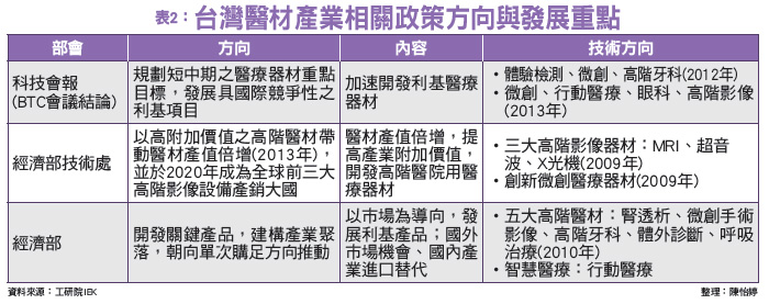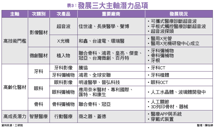 在生醫產業的發展與醫療照護上,IEK指出,未來十年的商機,均與高齡化議題息息相關,包含醫療照護需求的滿足、醫療效率的提升、醫療人力不足,以及醫療機構外的分散式解決方案,都是未來投資的焦點。未來重要商機將以可滿足醫療照護需求的輔具、眼耳牙科、呼吸治療產品等,可提升醫療效率的智慧醫療、診斷產品、微創產品等,以及提升健康與預防策略的出院照護的穿戴式、行動健康方案、智慧照護等為主。法人預期,未來結合醫材、軟體平台、決策系統,與雲端、巨量資料(Big Data)的相關服務模式,將成為台灣產業另一波的長線動力。另外,智慧健康產業近來也成為創投布局重點。全球創投資金已經連續幾年投注於智慧健康產業,二○一三年投資金額更超過十九億美元,與二○一一年相比更呈現一倍以上的成長,交易數量更有一四三%的成長,成長幅度前所未見。國際主要廠商看準使用者生活型態的轉變,紛紛推出相對應的硬體設備、軟體以及平台,希望藉此取得市場先機。而透過智慧健康醫療照護產業,也可帶動雲端與巨量資料發展機會,透過行動器材產業的蓬勃發展,將可形塑帶動遠距照護服務、雲端運算(Cloud Computing)和巨量資料發展,突破健康照護服務的困境。根據IEK資料顯示,ICT在健康照護應用市場二○一三年約四十二億美元,預估至二○二○年將可達六七三億美元,成為下一波重要的產業機會。ICT在健康照護市場蓬勃發展,包含行動健康醫療服務、穿戴式裝置與巨量資料等產品與服務快速成長,異業技術與資金逐漸投入醫材研發,加速醫材轉型,未來,產業也發揮關鍵技術開發與系統整合優勢,朝向發展高附加價值的產品與服務為主。台新投顧產經研究部襄理蔡逸賢指出,中國進入擴大內需時代,將從解決人口老化及戰後少子化等問題著手,因此從十二五計畫開始編列一連串的醫改政策,未來將明確以提高醫療品質為主要目標,初期建設方面將增加大型醫療檢測設備設置,因此也看好大型醫療設備代理業者,如F-合富(4745)、承業醫(4164)及鈺緯(4153)等公司。突破寡占封鎖線 找出獲利模式蔡逸賢認為,醫療器材產業在人口老化問題尚未有效控制下,長期以來需求只增不減。但是,台廠是否能夠突破各領域寡占廠商的封鎖線,找出獲利模式,才是更值得關注的地方。短中期而言,在美國實施歐巴馬法案之下,壓低醫材補助,迫使大廠在獲利縮減的情況下,尋找合作廠商或釋放代工訂單,在製造能力具備優勢的台廠受惠程度大,未來關注焦點在牙科、骨材、血糖儀、洗腎、檢驗設備和心血管耗材等領域,建議投資人可長線布局(表二、表三)。