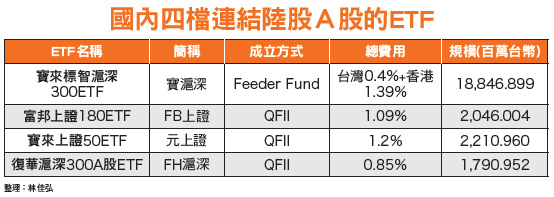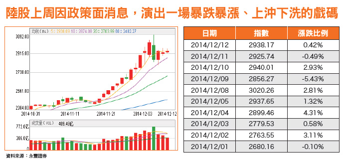 陸股上海A股指數,上周無預警演出暴跌暴漲戲碼,先是在周二(十二月九日)下午收盤前一個半小時重跌二五七點,由上午近三一○○點一路下挫到終場二八五六點,跌幅達五.四%,不但創下陸股五年來單日最大跌幅,成交值更爆歷史天量達一.二六兆人民幣(約合六.三兆台幣)。但大跌隔日(十二月十日)隨即出現下殺承接買盤,尤其是兩倍做多與放空都超過二萬一千張,顯示市場資金仍看好後市,終場大漲二.九三%,累計截至上周五(十二月十二日)止,上證仍站上所有技術均線之上,顯示多頭格局持續。回顧這波急漲急跌的陸股,台新證券經理黃文清指出,這波大漲起因人民幣上個月的降息效應,主漲類股為證券商、保險與房地產;相較以往人行多以降存準率、釋出資金以刺激市場的政策而言,此次人行直接降息來拉抬趨緩的經濟成長,可視作人行在為將來實施利率自由化做準備。元大寶來上證50基金經理人李孟霞則認為,這一波為期近兩周的軋空式陸股大漲,主要集中在金融股;漲勢太急再加上類股集中,本來就潛藏著回檔壓力,於是當陸股傳出債信在AAA以下的債券,不能做債融通交易的政策時,就引發日前帶量一兆二千億的大跌。而類似這樣急漲急跌的走勢,對未來仍由政策面帶動的大陸股市來說,勢必會成為家常便飯。陸股行情 長期看好雖然未來陸股暴跌暴漲的格局勢不可免,但站在投資獲利的角度來看,陸股自今年第三季以來的投報率,相較台股而言仍要高出許多─從八月中旬到十二月初,陸股已從二二○○點站上三千點大關;而同時期台股,卻一直在九千點上下震盪,就投報率來看,當然吸引投資人青睞,進而琵琶別抱。此外,標準普爾也預估今年年底前,中國上證綜合指數有可能站上三九○○點,所營造出的樂觀氛圍,讓投資人對陸股獲利可期。投資陸股的主要管道分別為購買A股基金、A股ETF、複委託與香港開戶,以及大陸開戶投資等,其中以投資陸股ETF方式最為簡便。陸股投資 兩路並進永豐滬深300紅利指數基金經理人林永祥指出,近期陸股相關標的交投熱絡,不僅ETF成交量火爆,還有同樣是追蹤指數的指數型基金,也是投資人購買陸股行情的標的。只是ETF和指數型基金的交易管道不同,前者如同股票是在證券集中市場交易,後者則是像買賣基金一般,可於投信、券商或銀行直接申購及贖回。元大寶來經理李孟霞表示,基本上購買陸股ETF的管道有二,一是在台股可以直接購買追蹤陸股ETF的股票,如一般我們大家熟悉的寶滬深、富邦180與上證50等;另外則是日前金管會開放可用複委託方式,在香港直接買進大陸A股連結的ETF。台新證券經理黃文清指出,相對於在台購買陸股ETF來說,複委託的交易成本並不便宜。以台股證券交易稅○.三%、交易手續費○.一四二五%,對比香港複委託的稅率以○.五%起跳,光從稅率來看,複委託交易費用就相對較高。此外,複委託還有換匯問題,且投資人還要另開外幣戶頭才能買賣。而台股購買陸股ETF,其遊戲規則與買股票一樣,相對簡單方便。李孟霞表示目前國內掛牌直接投資陸股的四檔熱門ETF,分別為三檔運用QFII額度直接投資A股ETF的FB上証、元上證及FH滬深,以及一檔連結A股的連結式ETF寶滬深。其中寶滬深的資金規模最大、流動率最好,也是大多投資人的購買標的。李孟霞分析指出,寶滬深是以滬深300指數為基準,也就是投資標的包括上海與深圳的前三百大企業;富邦180與元上證50則是以上海A股前一八○與五十大的企業為主;而明年大陸若開放深港通的話,那滬深300就會有較好的指數表現。以這波人行降息刺激陸股來看,占有金融股達六五%與五○%的元上證50與富邦上證180的獲利表現,就較寶滬深與FH滬深這兩檔要來得好很多。雖然ETF號稱懶人投資法,但仍建議投資人要以陸股未來的發展,作為選擇要點,如這波急漲的陸股是以金融股為主,若選擇的是以金融為主的ETF,那就獲利可期。觀察現階段走勢,首推金融股為主的ETF標的,其次則是能源類的ETF。投資方向 觀察官方政策投資陸股ETF應注意哪些重點?黃文清指出,首先要注意的是折溢價,其次是輪動上漲的類股投資組合,也就是要跟著上漲類股,改變投資標的,那又如何知道轉換投資標的最佳時機?黃文清建議,首先可以觀察總體經濟環境的趨勢,其次是留意每家投資機構的獲利報告,最後同時也是最重要的就是掌握大陸的經濟政策走向。由於大陸的經濟發展並非與全球經濟同步,而是由大陸官方政策決定一切,所以一定要抓準官方的政策方向,例如放寬保險業可以投資二級市場、融資購買股票等政策,才能在陸股ETF中獲利。