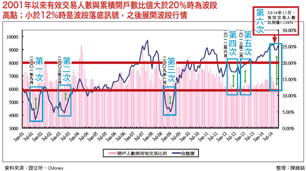 目前台股有效交易人數比例低於一二%,行情將再起。十四年來共有五次這種機會,後市都有相當可觀的波段漲幅。紛紛擾擾的大戶條款在立委們協商過後已暫時劃上一個休止符,雖然不盡令人滿意,但仍暫時可讓市場拋卻利空消息,加上美國聯準會的措詞令市場信心回籠,低油價將推升全球消費力道推升GDP,且低利率仍將維持一段時日,使得國際股市回神轉強。市場出現反擦鞋童理論但時序已接近年底,盤勢能否繼續走強?法人作帳行情是否接近尾聲?都牽動投資人的選股方向。 股市中有個著名理論稱為「擦鞋童理論」,擦鞋童是屬於社會上最為弱勢的族群,他們通常沒有多餘的資金能夠進行股票投資,因此他們不太會關心股市的漲跌,或是談論股票的話題。而在多頭市場的行情上升走勢中,當這個最弱勢的族群都開始關心股市話題,並且願意將有限的資金投入股市時,代表市場行情已經過熱,所有人均已進入市場,未來也沒有其他買盤能夠介入,所以投資人滿手股票無人能承接,股價將失去支撐動力,後市就趨向悲觀。但反觀若市場對行情均不看好,亦無人留意股價走勢,代表市場願意買進股票的人不多,大多留在場外觀望,因此市場行情已經過冷,未來人氣將逐漸回流,就有可能推升市場行情向上。有效交易人數比例低於一二% 行情將起下頁附圖是統計自二○○一年起,全國證券投資人的累積開戶人數與有效交易人數的比例,以及台股加權股價指數的走勢對照圖。從中可發現自二○○一年起,每當市場上有效交易人數,在累積開戶人數的比例高於二○%時,市場人氣已經過熱,指數將出現反轉向下的走勢;而當此比例低於一一.五%時,也表示市場人氣過低,無人願意介入股市,在未來人氣回流的買盤帶動下,行情將落底反轉向上。在二○○一年九月、二○○三年三月、二○○九年一月、二○一二年六月、二○一三年二月共五次,全國證券投資人的累積開戶人數與有效交易人數的比例均低於一二%,而指數波段低點亦在此出現,隨後即反轉向上,且波段漲幅相當可觀。