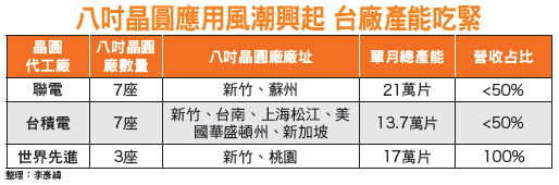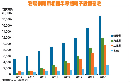 全世界最能掌握科技業發展節奏、也是產業景氣榮枯風向球的台積電董事長張忠謀,在今年三月底於台灣半導體協會,以「The Next Big Thing」為題發表演說,並在產業前景的分析中點出了「物聯網」的應用風潮,範圍包括居家、教育、醫療、交通、商業、軍事等多面向的應用,其不僅將為全球帶來高達數以「兆美元」計算的超級商機,也將成為未來全世界科技產業的發展重心。爾後,幾乎所有相關的科技業者,都已積極布局、搶食市場商機。根據全球物聯網IC設計龍頭恩智浦所做的市場調查報告,全世界的物聯網商機預估將在十年內大幅開展;至二○二○年,全球物聯網市場,包含智慧家庭、汽車電子、商業活動在內,總產值將大幅增加達一.九兆美元。由於物聯網的商機如此巨大,預期將可強勢帶動如感測器、MCU、家庭安控、藍牙晶片、RF晶片等半導體製成品的需求。在台灣所有的科技集團當中,目前即以「聯家軍」競逐物聯網的布局版圖最為完整,搶下市場商機成功機會也最大。穿戴裝置、指紋辨識、汽車電子 引動八吋晶圓商機由半導體晶圓代工八吋廠所生產出來的IC晶片(元件),應用極為多元,包括:CMOS影像感測器、MCU、MEMS(Micro-electro-mechanical Systems,微機電系統)、電源相關設備等裝置內的IC晶片,皆為可能搭載的半導體元件範疇。前述主要由八吋晶圓廠生產的IC元件,亦大多內建搭載於行動裝置、物聯網、穿戴裝置、智慧家庭、指紋辨識、汽車電子等,相關次產業領域的應用風潮已開始明顯增溫,也因而大幅推升半導體產業對八吋晶圓廠IC晶片的代工需求。同時,由於國外晶片大廠從今年第二季開始,早就針對LCD驅動IC、觸控、影像感測、光感測、G-Sensor、高階電源管理、指紋辨識、近場通訊(NFC)、無線充電等多種IC晶片大舉拉貨、搶訂產能,也迫使台灣LCD驅動IC、類比IC設計廠,現在只能無奈排在後面,苦等晶圓代工產能。由於需求增長的力道異常強勁,使得八吋晶圓廠產能自今年以來,即出現嚴重供不應求的窘況,供需缺口已達兩成幅度。聯電於中國目前擁有以○.一八、○.一五微米成熟製程為主的八吋廠,考量客戶端的拉貨需求,現已積極展開擴產,加速擴充蘇州和艦廠產能,近期月產能為五萬多片,明(二○一五)年第一季底,預計將達六萬片。另一方面,同樣積極進軍中國晶圓代工市場,不願錯過此波八吋晶圓熱潮的全球晶圓代工龍頭─台積電(2330),亦將加快速度,擴增上海松江八吋晶圓廠產能,達月產能十萬片水準,以滿足市場最吃緊的八吋晶圓代工需求。世界先進原本已有二座八吋廠,月總產能近十四萬片,七月新購買的八吋廠已加入營運行列,預估月產能可新增三萬片以上,將可有效紓解IC晶片設計廠產能需求,也可望順利帶動公司未來二~三年的營運成長。對已經與中國半導體業者開始合作的聯電而言,將可以藉集團母雞帶小雞的方式,協同中國科技業者,搶食包含中國在內的全球市場,以及涵蓋物聯網、八吋晶圓應用熱潮的龐大商機。精兵強將 聯家軍穩操勝券