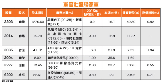 以聯家軍個別成員的市場競爭力分析來看,母公司聯電,憑藉晶圓代工先進製程領域的強勁競爭力,旗下產能已被多家TFT-LCD驅動IC、電源管理IC,以及指紋辨識IC廠客戶搶訂一空,預估在二○一五年將成為全球半導體八吋晶圓代工的最大贏家。此外,聯陽(3014)亦憑著感測晶片研發,在製造領域深厚競爭實力,市場最近傳出其已成功通過Google穿戴式平台Android Wear認證,後市可望順利打入智慧手錶的供應鏈。聯傑(3094)因為在網通IC晶片的研發上具備獨到的技術,有機會成功搶得智慧家居、智慧醫療、安全監控等應用領域的晶片訂單。智原(3035)向來在ASIC產品及IP矽智財的研發領域備受肯定,未來極有機會繼續與位居全球領先地位的半導體IP矽智財提供商安謀(ARM)合作,搶進規模龐大的物聯網市場。原相(3227)挾著在影像感測IC豐富的研發經驗,以及高滿意度的客戶評價,接下來也很有機會能夠大舉搶得由穿戴裝置、汽車電子、智慧家庭、商業活動衍生出來的物聯網商機。另外,盛群(6202)同樣可透過以往於MCU、IC研發所累積的雄厚實力,成功搶下隨著物聯網興起的大餅。市場法人提前布局 築成堅強壁壘看好聯家軍個股後市的營運前景,外資、投信市場法人,總是有辦法領先散戶投資人知悉重大、關鍵訊息,因此多已在股價尚未反映基本面的利多消息之前,便提早進場布局買進、建立持股部位。