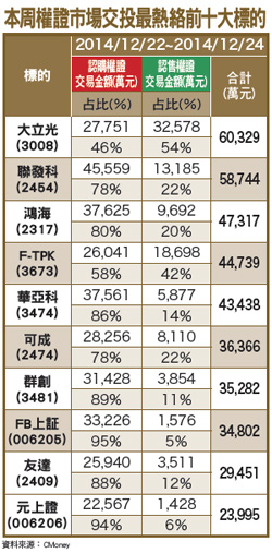 本周IC設計大廠聯發科(2454)重回交投熱絡標的亞軍,由於印度手機市場前景佳,外資分析師看好相關零組件公司,並首選聯發科,認為其目前股價極具吸引力,加上聯發科發展無線充電技術,明(二○一五)年可望趕上高通,利多加持下吸引相關資金進駐認購權證,本周看多比也回升至近八成高水位。十二月下旬面板報價,電視面板優於其他中小尺寸面板持續上揚,對於努力衝刺大尺寸出貨的面板雙虎友達(2409)、群創(3481)及相關面板供應鏈有利,本季營收可望淡季不淡,股價相對大盤強勢。而連結陸股ETF之認購權證交投持續熱絡,唯陸股雖在漲多後震盪加劇,投資人在投資相關認購權證時宜嚴格執行停損停利並以買黑賣紅為原則。根據過去十年聖誕節後一周台股上漲機率高達九成的經驗,目前至年底大盤處於容易上漲的時間,建議投資人可留意具油價下跌受惠及明年產業展望樂觀個股,利用認購權證參與行情。
