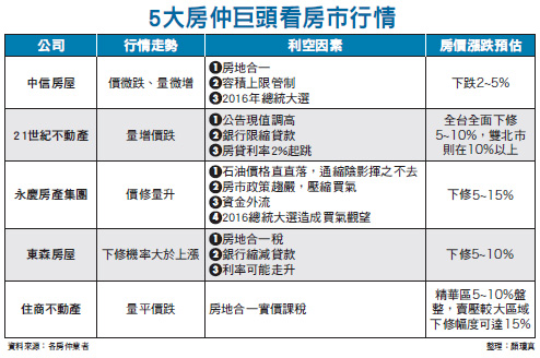 台灣房市在二○一四沉悶了一整年,進入二○一五年後,行情仍不見轉好,尤其上有「房地合一」實價課稅及央行升息的壓力鍋蓋,使得房仲業各項買氣調查,看壞房市的比例升高。面對新的一年,房市會如何走?若是多頭轉空頭,房價會下修多少?而當房價開始鬆動後,何時是自住型購屋者進場的好時機呢?二○一五年房市走勢 利空摜頂《理財周刊》特地邀請中信房屋副總經理劉天仁、永慶房產集團房產事業群總經理葉凌棋、21世紀不動產董事長王福漲、東森房屋董事長王應傑,及住商不動產總經理陳錫琮等五大房仲巨頭,為讀者剖析二○一五年房市走勢。《理財周刊》問(以下簡稱問):去年房市因政府打房,以及九合一選舉的干擾,可說是「悶」到不行,而今年的景氣看法為何?中信房屋副總經理劉天仁答(以下簡稱劉):根據中信房屋去年第四季宅指數調查,有三四.七%的民眾看壞今年第一季的房價表現,而展望今年房市總體應是價微跌量微增的走勢,主要是政府實價課稅及查稅等動作,不動產市場難望大幅轉好。