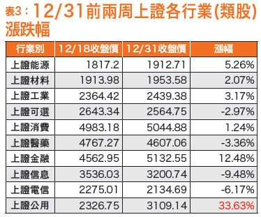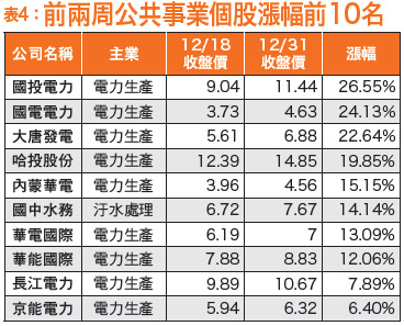 大方向確定之後,接下來就讓我們具體地選股吧!按照一般Top-Down選股流程,大盤方向確定之後,接下來就要看類股表現狀況。上海證券交易所將掛牌的股票根據國際主流行業別,分成了十個行業,茲依照前例統計近兩周類股漲幅後,整理如表三。由表三可知,近兩周漲幅最大的行業別為公用事業類,且漲幅遙遙領先其他類股,相當具有指標意義。屬於此類別的個股主要從事之商業活動為「電力、熱力、燃氣及水生產和供應」,另外汙水處理也包括在內。