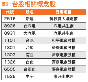 表四依然以近兩周的表現,將公共事業類股所有個股漲幅進行排序,並取前十名列出。這十家企業中,有九家從事電力生產活動,而反映環保中國概念的廢汙水處理公司則有一家。顯而易見地,本波公共事業類股的漲勢,主要受惠於電力生產企業的表現,因此在台股進行個股選擇時,便該首先考慮擁有電廠,進行電力生產的企業。除此之外,受惠於大陸「十三五計畫」將大力推動環保總體規劃,預期整體環保市場需求將達到十兆人民幣,其中光是氣、水、土三項行動計畫就有望超過6兆人民幣,加上「水十條」已基本編制完成,因此廢汙水處理將成為首先受惠產業,後市相當看好。電廠投資受惠成亮點綜上所述,以下篩選出台股九檔相關概念個股,陳列如表五;當中八檔為電力生產相關、一檔為廢汙水處理相關股。