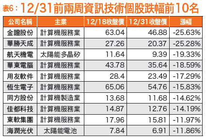 近兩周來跌幅最大的資訊技術行業類股,亦是值得重點關注的部分。表六將指數成分股進行統計,並進行前兩周跌幅前十大之排名,可以發現十家企業中,有七家從事計算機服務業、兩家從事太陽能相關產業、一家為計算機製造業。依據表六,投資人最應該關注的產業類別為「計算機服務業」;然而此名稱與台灣習慣用法出入較大,需重新定義以方便類比。所謂「計算機服務業」意指「滿足使用計算機或信息處理的有關需要而提供軟件和服務的行業」;由於台灣對於資訊服務業的定義分為「電腦系統設計」及「資料處理及資訊供應」兩大類,內容已包含軟體設計與資訊服務,故可類同上證對計算機服務業之分類定義。因此,近期投資計畫若有切入資訊服務產業的打算,在步調上需謹慎一點,尤其是近期表現偏弱的個股,例如商店街(4965)、凱衛(5201)、數字(5287)等,即需特別注意。東風無力百花殘 量能不繼上漲難眾所皆知,陸股在二○一四年的漲幅主要來自資金行情推動,總計滬深兩市全年合計成交七十五兆人民幣(約三八三兆台幣),創歷史天量,更曾連續數日成交量破兆,創下全球資本市場新紀錄。在資金挹注、行情滾燙下,也順利激起投資人的熱情;根據《華爾街日報》報導,上證A股的新開證券帳戶數已達三年新高,全民瘋股票的熱潮可見一斑。反觀台灣,自二○一二年前財政部長劉憶如強推證所稅以來,台股量能急速冷凍;去年底,「大戶條款」吵得沸沸揚揚,財政部長張盛和毫無意外地又一次站在市場對立面,為了能課徵十億元的大戶條款,完全無視於證所稅實施到二○一三年六月,證交稅短徵近五五○億的事實,讓人不禁質疑財政部長的專業判斷。因此,三年緩徵的妥協,希望能吸引大戶資金回流、啟動台股複製這波陸股資金行情,展開台股的元月行情。