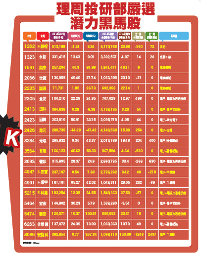 美元強勢,電子股重回主流地位,大數據鏢股推出以來,力特、錩新、營邦、進階等表現不俗,內行的讀者應該早已惦惦吃三碗公,荷包漸漸飽滿。首先,恭喜讀者上周買進錩新(2415),期間最大漲幅達一○.八四%,新開年馬上賺到開寶紅包財,今年肯定會持續的賺不停!當然也就要持續鎖定「大數據鏢股」專欄,才能「百發百中」、「喜賺不停」!本周由理周投研部持續透過最新公布財報數字分析比序、獲利力延續力道強弱研判、市場法人加碼力強度分析、市場籌碼歸屬方向釐清等重要選股程序,層層篩選、精挑細選出的農曆年紅包行情漲升潛力「鏢」股,絕對不是亂射飛鏢,經得起市場考驗。投資人拉高視野,跟上理周投研部的節奏,一起布局最有潛力的標的。財報年度營收亮眼 法人籌碼動見觀瞻本周理周投研部所精選出標的個股中,財報年度營收數字表現亮眼者有:全友(2305)、鼎元(2426)、光環(3234)、普萊德(6263)、世德(2066)、聰泰(5474)、F-綠悅(1262)、謚源(2235)、F-科嘉(5215)、F-環宇(4991)、營邦(3693)、宏捷科(8086)等個股。另外,其陽(3564)、錩泰(1541)、聰泰、宏捷科等個股,去年十二月營收數字的年增率都同樣高達五○%以上,聰泰、宏捷科年增率更雙雙較前年同期大增達倍數及三倍以上,時序上各產業幾乎為傳統淡季的此刻,可以說能夠有這樣亮眼、高於水準之上的亮麗成績單,實屬不易!至於在籌碼歸向分析方面,在理周投研部所選出的標的個股中,市場外資及投信法人近期較為看好、鎖定,進場同步買超的標的股為光環。外資及投信分別看好、買超的個股有:全友、鼎元、F-環宇、宏捷科、營邦、F-綠悅等。光環、營邦、F-環宇財報佳 法人買超強力按讚光環(3234):光環科技成立於一九九七年,於二○○三年掛牌上櫃,為台灣老牌光通訊元件廠,目前營收項目比重占比最高者為「雷射二極體」,多應用於網路通訊光纖組件之用。近期財報公布二○一四年十二月合併營收達二.六六億元,年增率高達四三.三七%。由於看好光通訊產業未來可望持續穩定成長,董事會日前決議斥資八億元新台幣,將用以增添機器設備、擴充產線工程,有效解決現階段產能不足問題。新增產能今年起將可陸續上線投產,未來公司總產能將大幅增加五成,預估今年業績將可見到強勢衝高表現。營邦(3693):營邦企業公司成立於一九九六年,於二○一○年掛牌上櫃,為台灣電腦及伺服器機箱專業產銷、資料中心建置廠,目前營收項目比重占比最高者為「電腦及伺服器用機箱」,占比次高者為「系統平台產品」。二○一四年十二月營收為三.一六億元,年增率為二四.六○%。由於為市場認定為「大數據」應用、資料中心概念股,近期股價因此見到明顯漲升表現。今年四月新產能即將開出量產,伺服器系統組裝總產能將可較二○一四年,大幅提升五○%~六○%。市場法人機構預估,後續營收可望跳增三成,今年有機會力拚達陣,賺一個股本。F-環宇(4991):環宇通訊半導體控股公司成立於二○一一年,於二○一二年掛牌上櫃,為專業通訊用高階射頻元件、光電元件晶圓製造代工廠。二○一四年十二月合併營收為一.六一億,年增率多達四二.○二%。全球光電元件市場的競爭廠商較少,公司近年來積極布局高毛利「利基型光電產品」,目前在手主要客戶群包括:RFMD、TriQuint、聯鈞、海信等光纖、射頻元件大廠。現階段營收比重方面,光電產品占整體營收比重已拉高至四成,射頻產品則占營收比重約六成水準。F-環宇目前的產能調整,由於射頻市場已見飽和,將逐步以產製光電產品為主。預料後市在光纖產品的拉貨力道持續增強的加持下,且手機客戶的PA(功率放大器)出貨數量亦持續成長,後市營運將見到高角度成長。